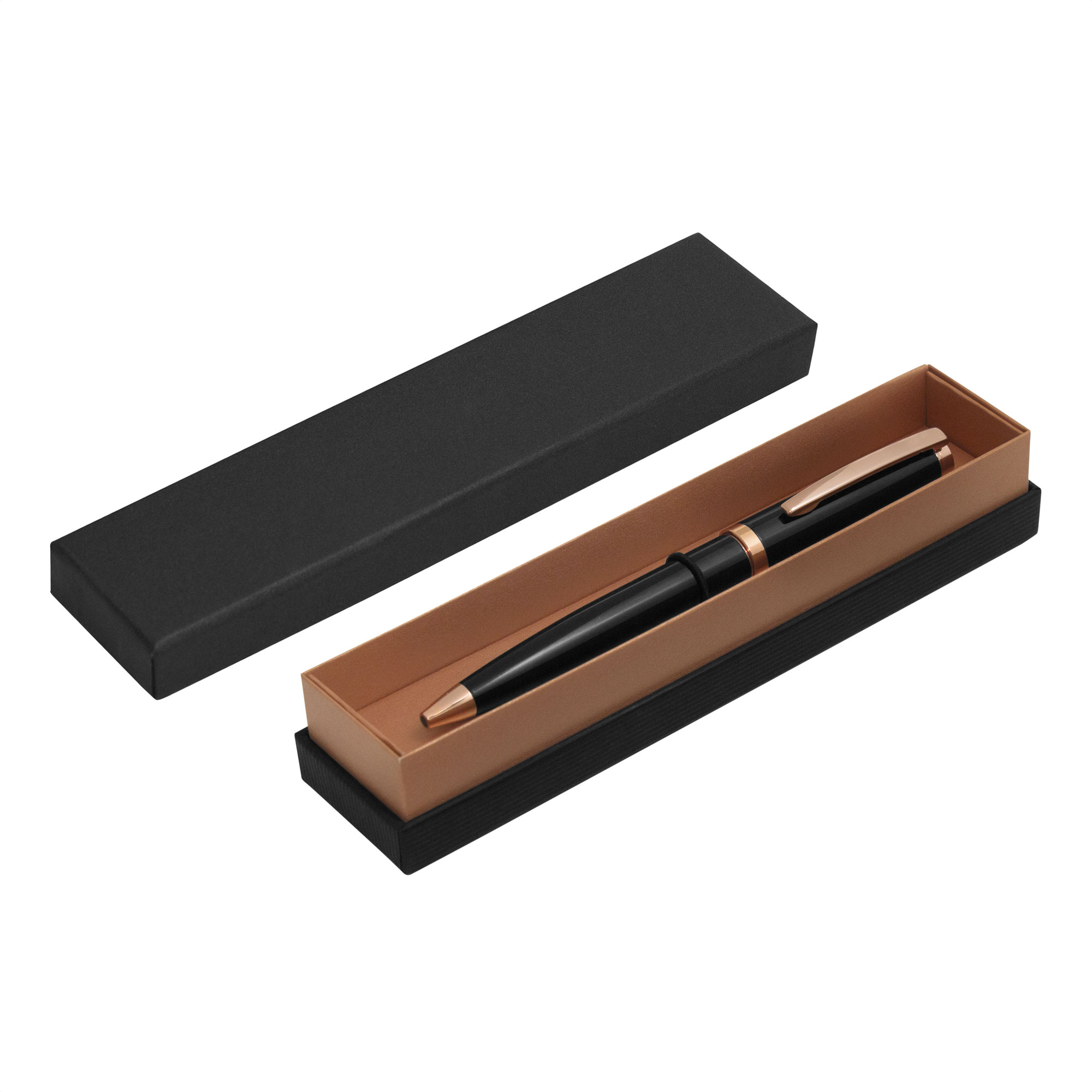Este bolígrafo se entrega en una caja de regalo color negro con un elegante detalle metalizado en rose gold en su interior, lo que eleva aún más su presentación y valor percibido. Su estética lo convierte en una opción perfecta para celebraciones empresariales, entregas de reconocimiento o acciones de branding premium.
