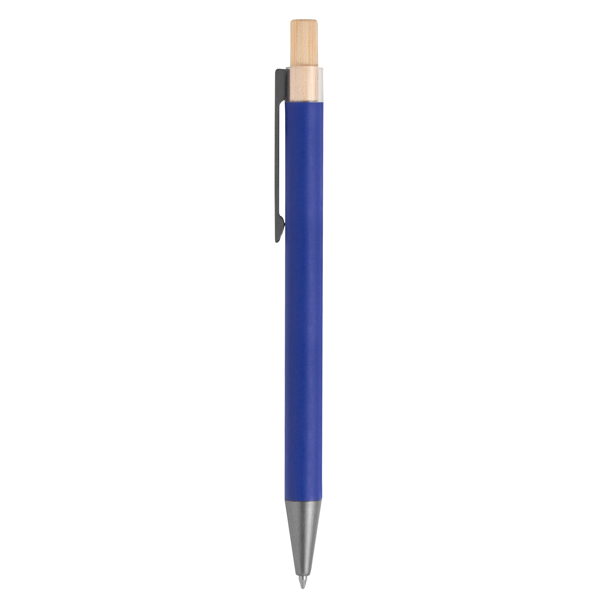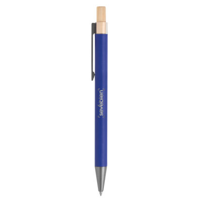 El cuerpo metálico de acabado mate está disponible en una variedad de colores, lo que lo hace versátil para adaptarse a los lineamientos de cualquier identidad visual corporativa. El clip metálico refuerza su estructura y aporta un look ejecutivo, mientras que la puntera plástica en gris mate armoniza con el resto del diseño. El detalle diferenciador es su pulsador de bambú natural, que aporta un toque cálido y ecológico al conjunto.