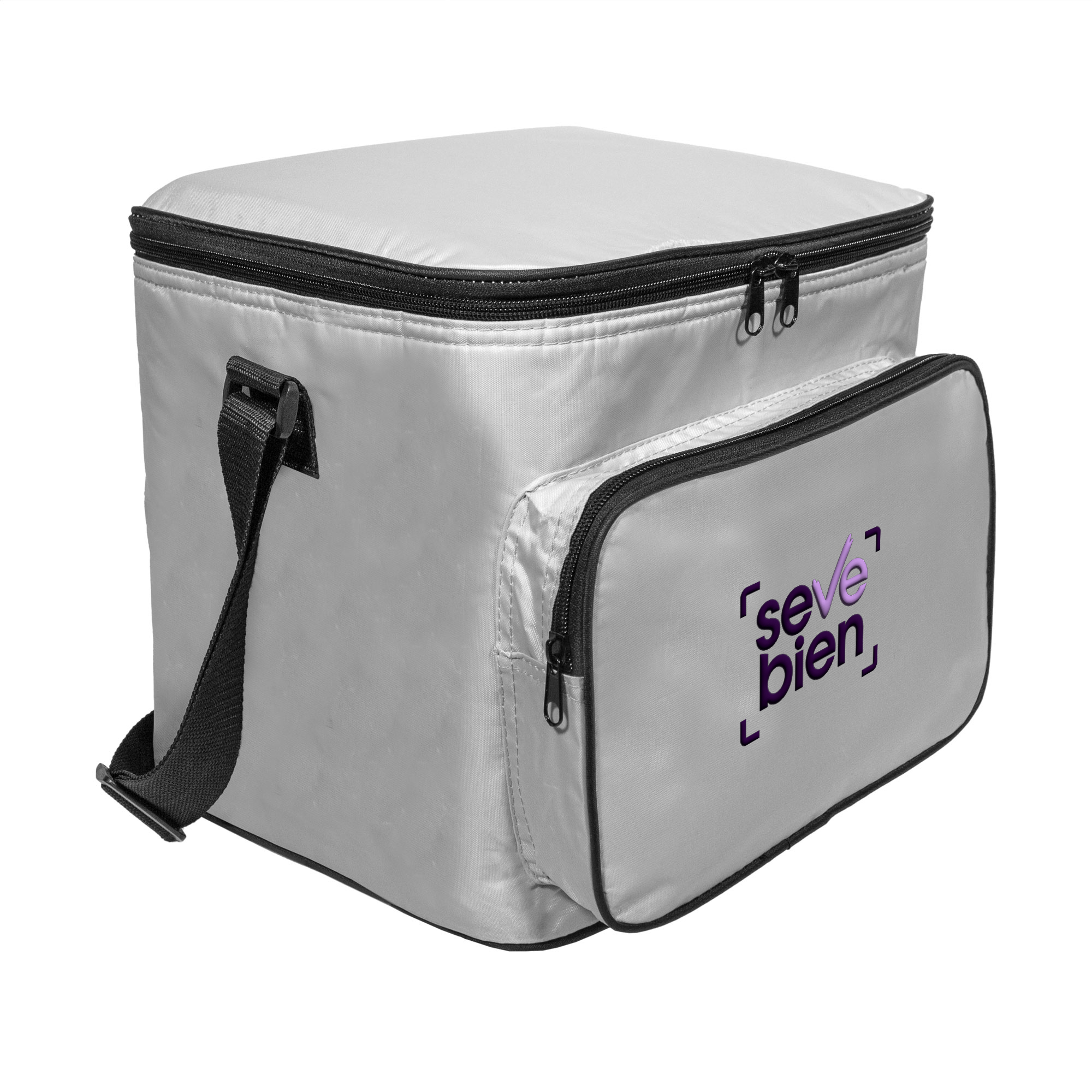 Fabricada en poliéster 420D, esta bolsa cuenta con un interior recubierto de aluminio, ideal para conservar el frío o calor de su contenido. Su exterior incluye un bolsillo con cierre, perfecto para guardar objetos pequeños como llaves, cubiertos, servilletas o snacks.