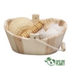 Incluye cepillo de pelo, esponja malla, masajeador de madera, piedra pómez y una esponja de masaje corporal, lo que lo convierte en un kit de cuidado personal completo. Su presentación cuidada y materiales nobles refuerzan un mensaje de preocupación por los detalles y compromiso con la calidad.