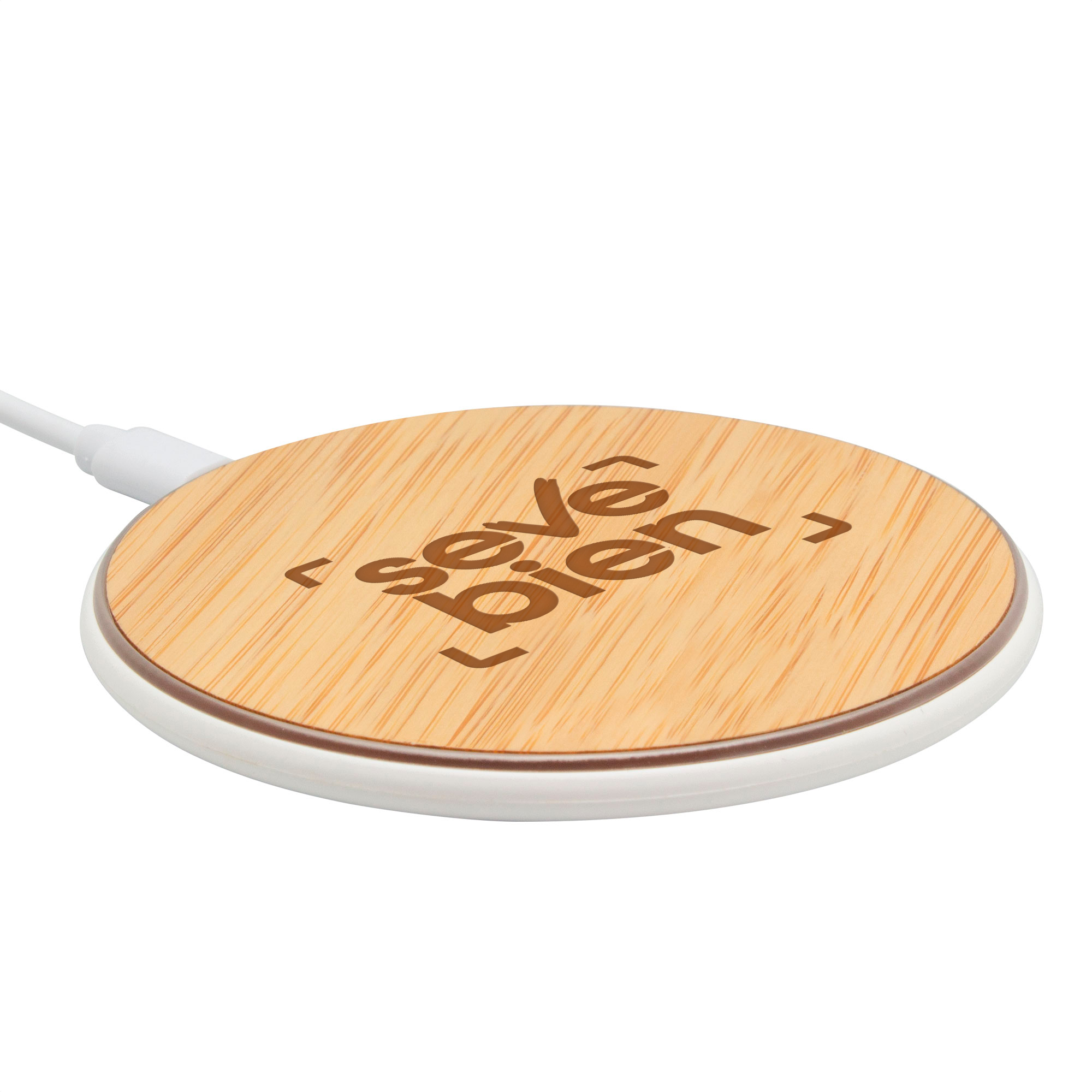 Este cargador inalámbrico rápido de 15W combina diseño ecológico y tecnología avanzada. Fabricado en bambú natural y plástico ABS blanco, con base antideslizante, ofrece una experiencia de carga eficiente y segura para celulares con tecnología Qi.