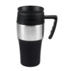 Mug térmico de doble pared aislante con tapa rosca de acero inoxidable y dosificador. Interior de PVC negro y exterior de PVC negro y acero inoxidable.