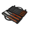 En su interior, este completo set incluye 7 herramientas de acero inoxidable de uso profesional: tenazas, cuchillo, espátula, cepillo de limpieza, pinchos y otros utensilios esenciales. Cada herramienta se ajusta perfectamente al maletín mediante correas internas, lo que facilita el orden, transporte y seguridad del contenido.