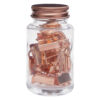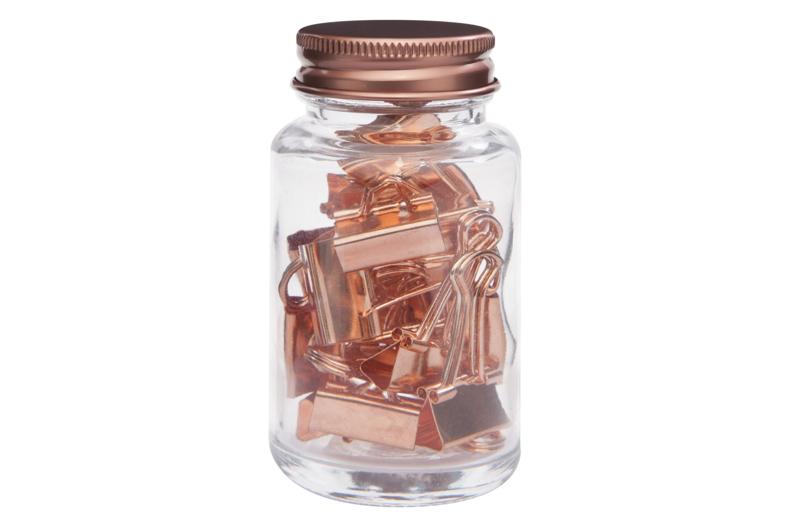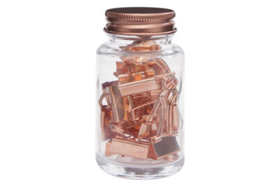 El frasco está fabricado en vidrio transparente, lo que permite visualizar fácilmente el contenido. La tapa metálica asegura un cierre firme y mantiene los clips protegidos del polvo. En su interior, encontrarás una selección de clips metálicos ideales para agrupar documentos, notas o papeles importantes.